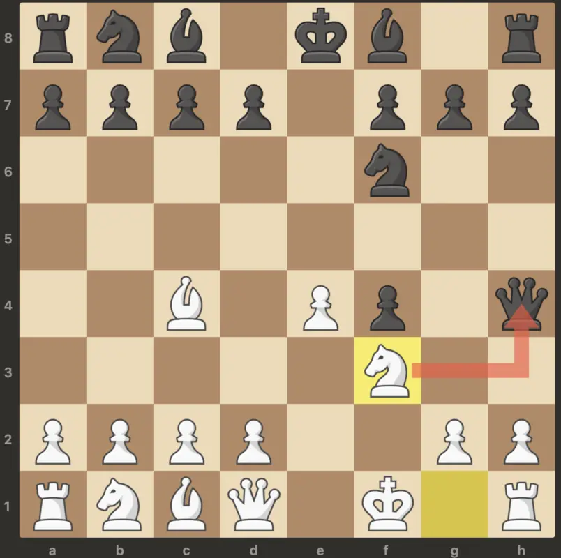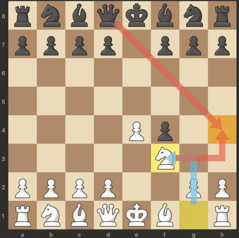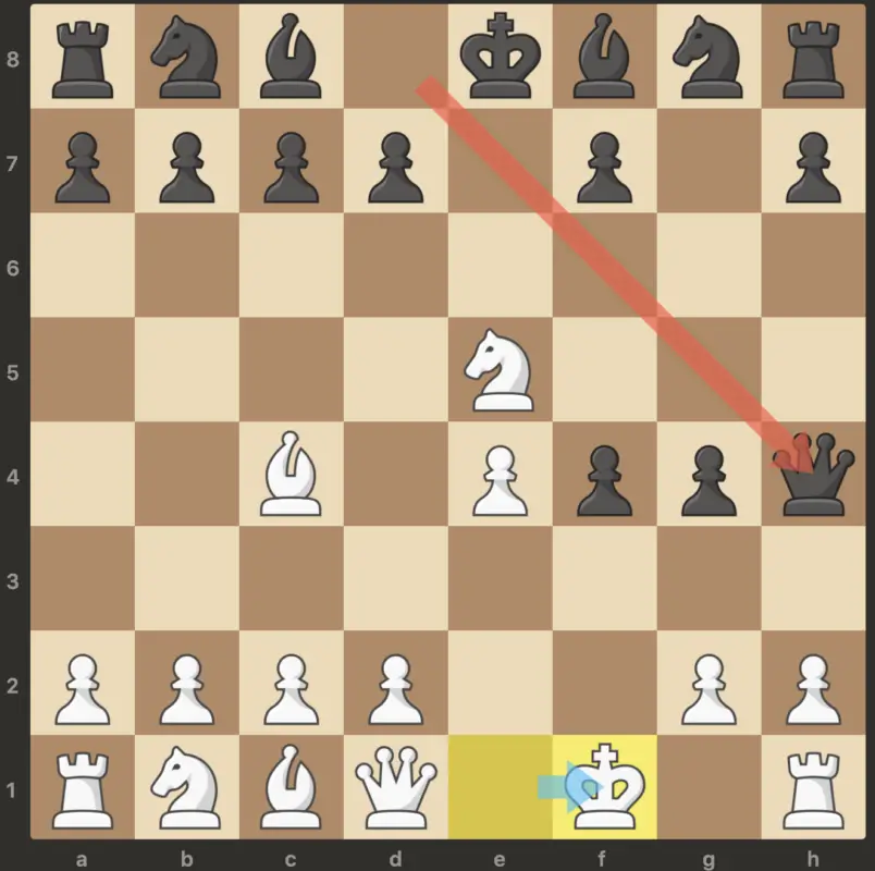 Con esta jugada, las blancas ya han desarrollado su alfil y caballo, mientras que las negras sólo han movido su peón. Las negras continuaron moviendo su dama a h4, atacando al rey. Incluso si el rey no puede enrocar, puede moverse a la casilla f1, que es la opción más segura.