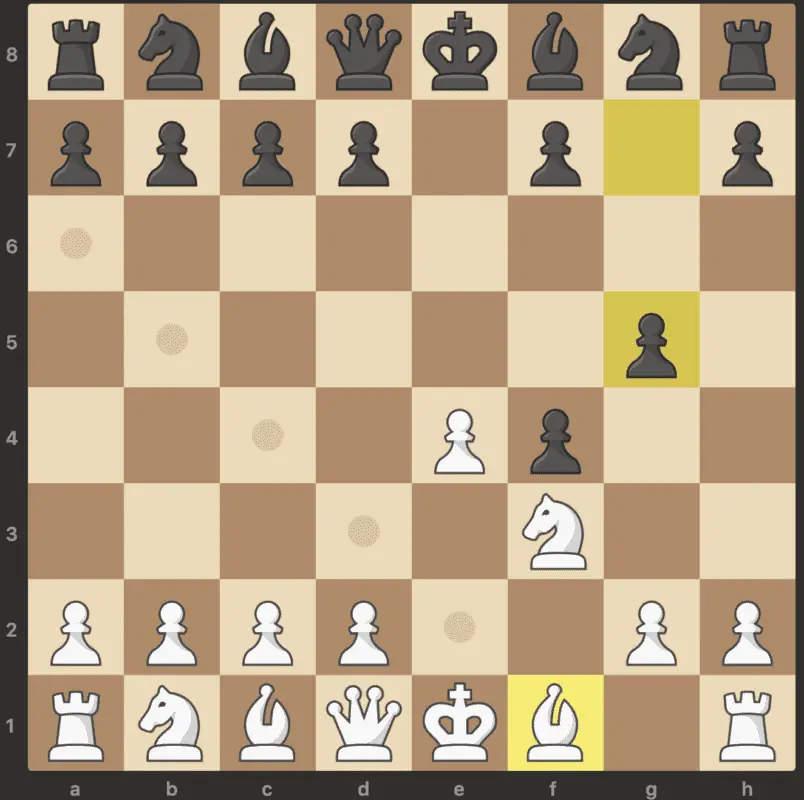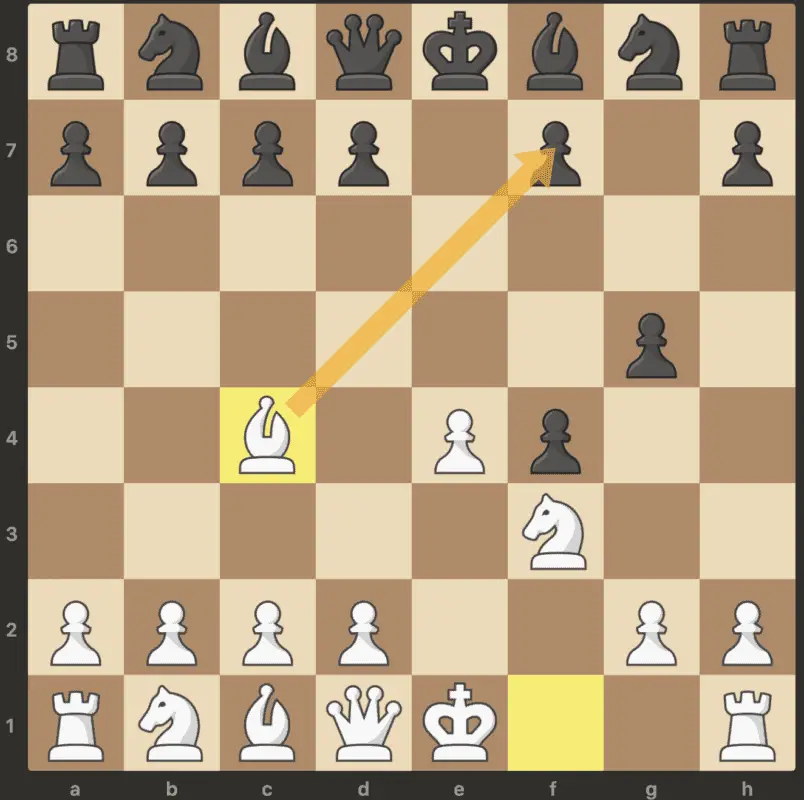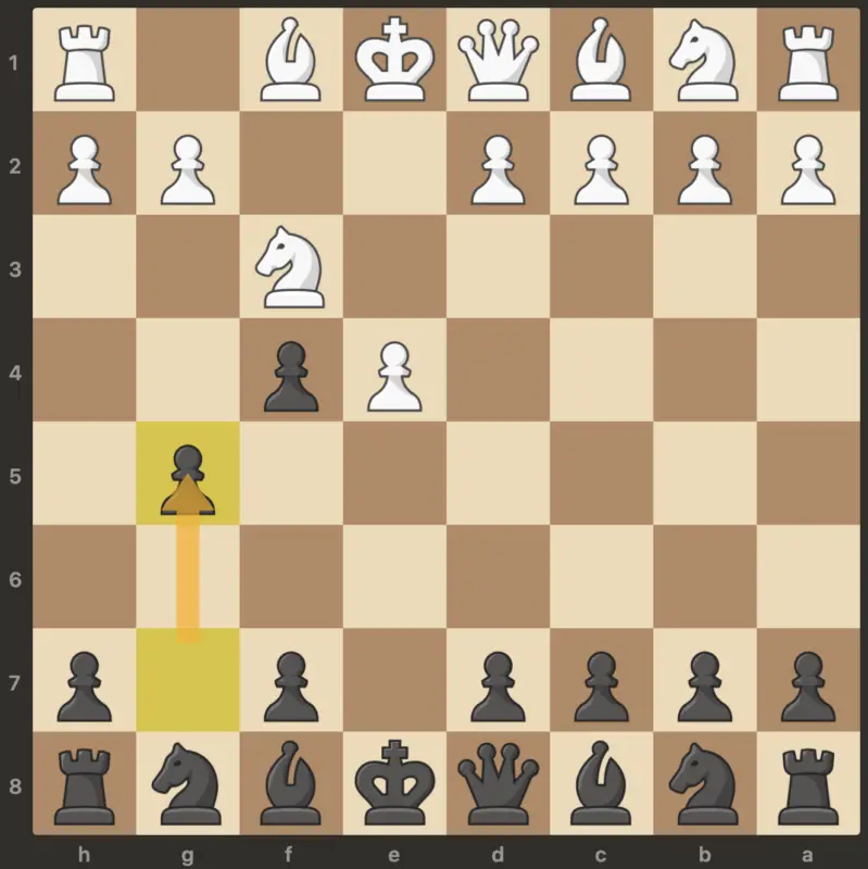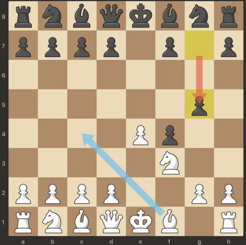 Ahora, las negras intentarán proteger su peón f4 moviendo otro peón a g5 (ver imagen a continuación), mientras que las blancas comenzarán a desarrollarse rápidamente moviendo su alfil a c4 y apuntando al peón más débil en el flanco de rey de las negras. Mientras que las blancas planean enrocar, las negras siguen siendo su rey en el centro y tienen un flanco de rey débil.