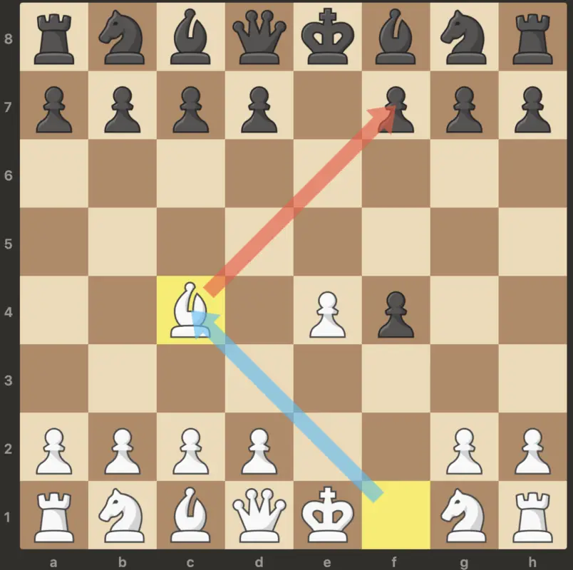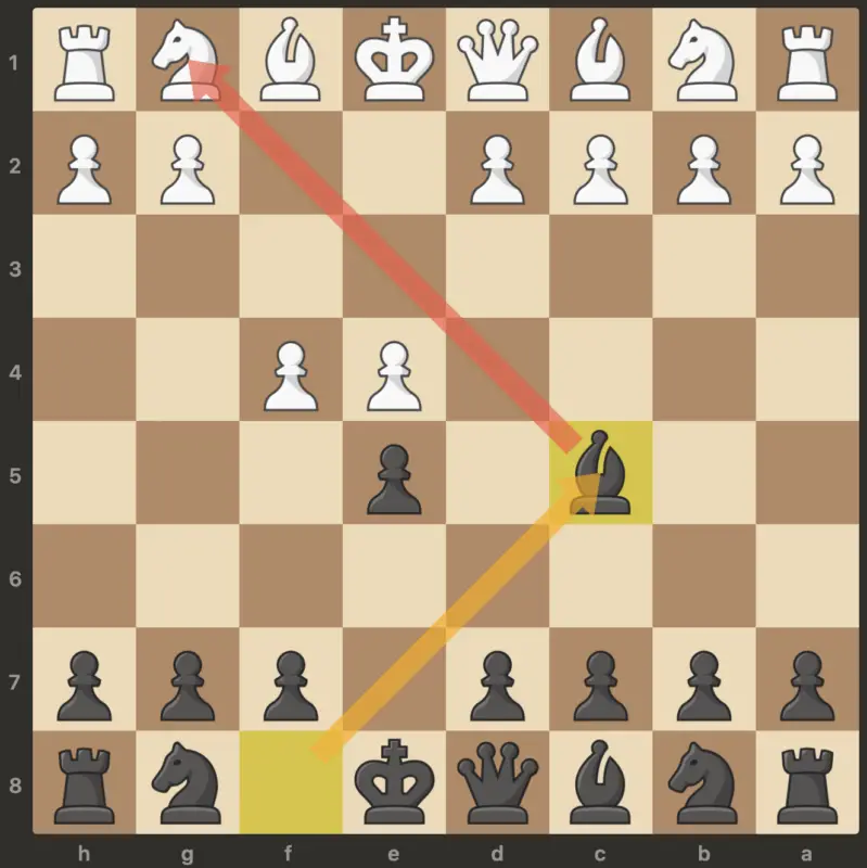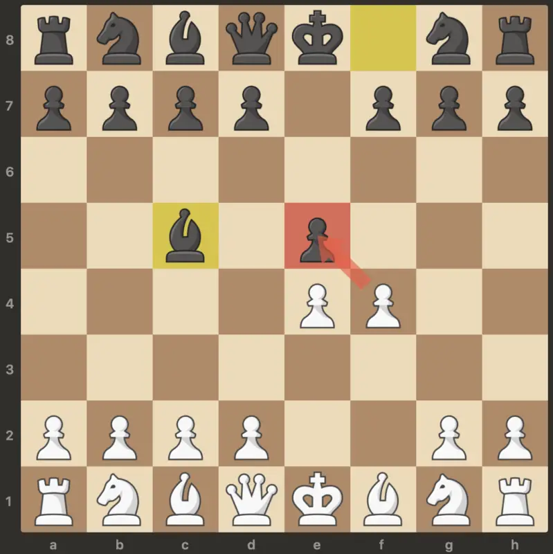 Como resultado, si estás jugando el gambito de rey con las negras, puedes evitar que las blancas enroquen moviendo tu alfil a la casilla c5, y puedes comenzar a desarrollar tus otras piezas y preparar un ataque.