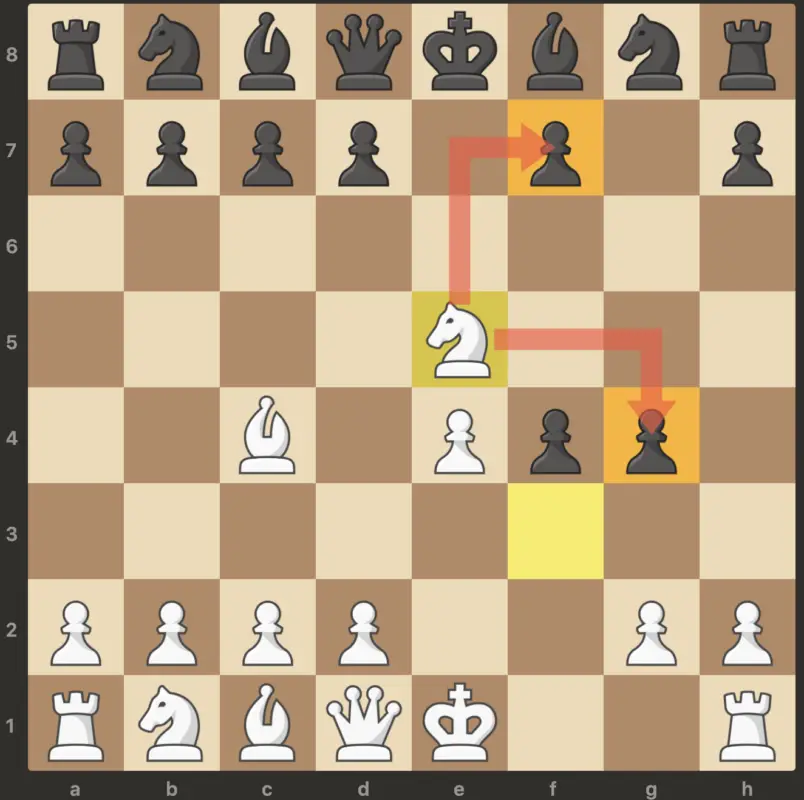 Luego, las negras atacarán su caballo en f3, el mejor movimiento de su caballo será moverlo en la casilla e5 atacando el peón f7 y al mismo tiempo atacando el peón g4 de las negras.