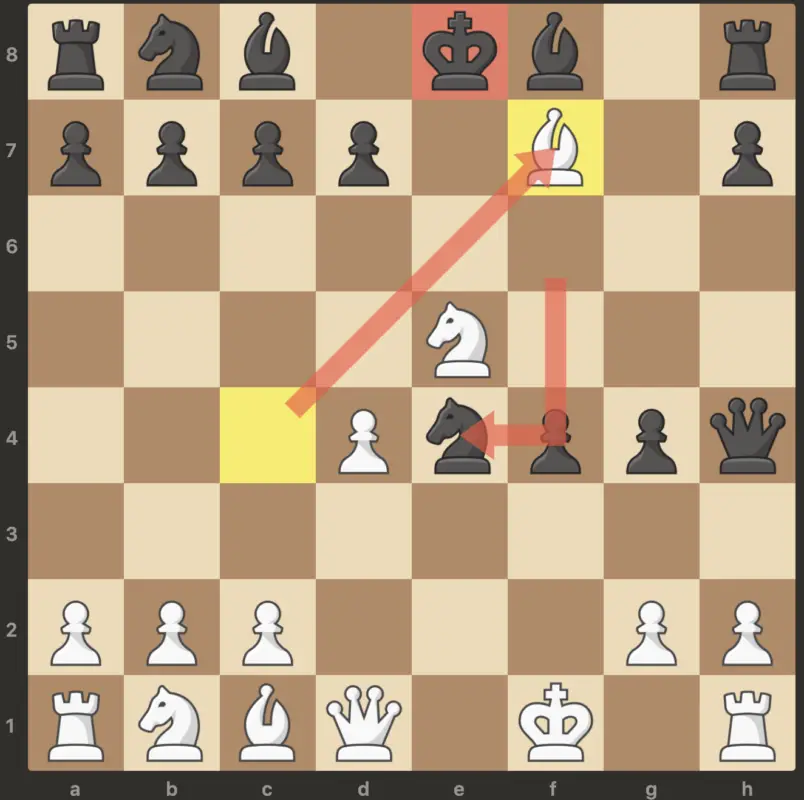 El próximo movimiento de las negras es el caballo a f6, que atacará el peón de e4. El próximo movimiento de las blancas es avanzar el peón a d4. El peón de e4 de las blancas es capturado por el caballo, mientras que el siguiente movimiento de las blancas es tomar el peón de f7 que ataca al rey.