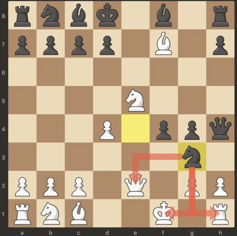 Un jaque mate de un movimiento en la casilla f2 de las negras debe evitarse en este momento. Aquí la mejor jugada de las blancas es la dama a e2 atacando al caballo negro. Black luego ataca con un tenedor real, atacando al Rey, la Reina y la Torre.