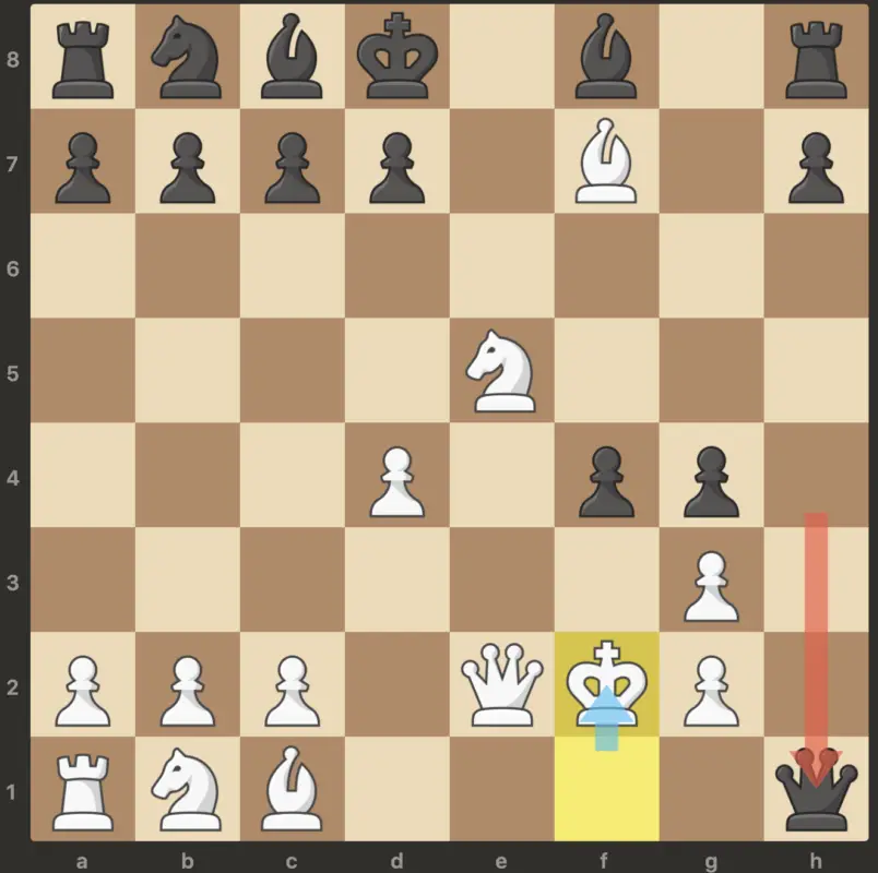Parece que las negras están ganando, y el único movimiento de las blancas es capturar el caballo con el peón h2, exponiendo su Torre. Esto conducirá a un jaque de la Reina Negra y su Rey solo puede moverse a la casilla f2.