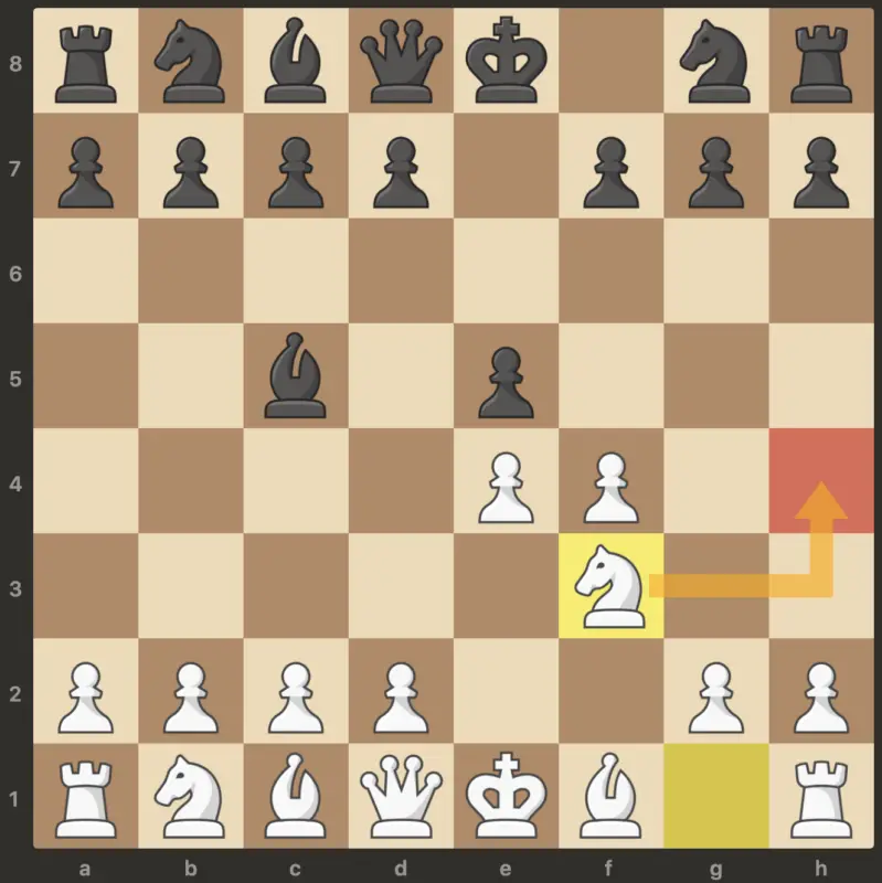 Entonces, después de mover tu peón a f4 y las negras aceptan el gambito, moverás tu caballo a f3 y jugarás la línea principal. Si las negras cometen el error de aferrarse a su peón negro f4, entonces las negras pueden caer en una trampa.