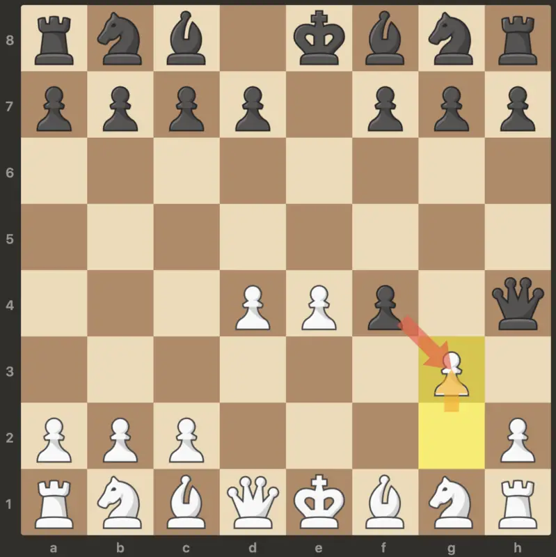Después de que las negras capturan el peón f4, el siguiente movimiento de las blancas es defender la casilla h4, que es vulnerable al ataque de la dama negra.