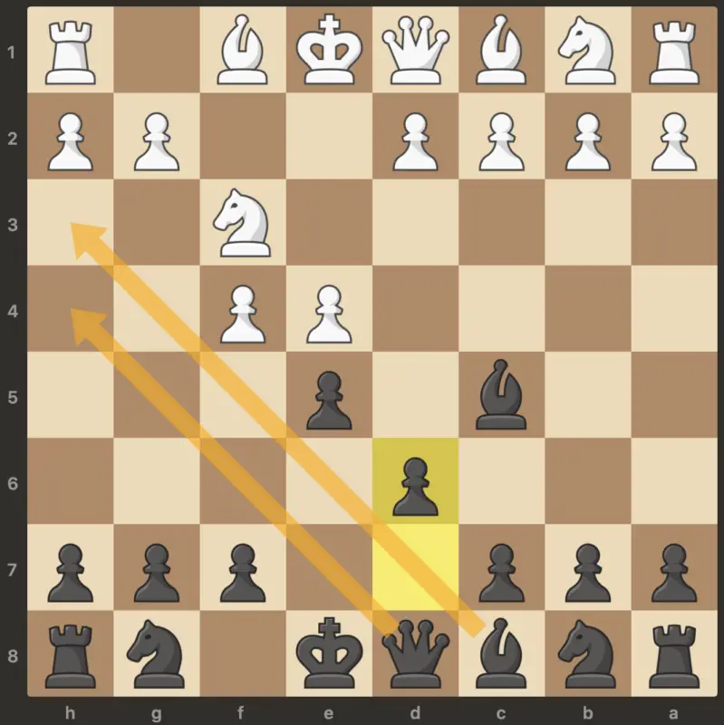 El siguiente plan de las blancas es desarrollar sus piezas rápidamente y, como negras, lo que deben hacer es abrir su alfil de casillas claras moviendo su peón a d6 (ver imagen a continuación), esto configurará sus piezas para atacar a las blancas con su alfil y su reina en un poderoso cuadrados diagonales.