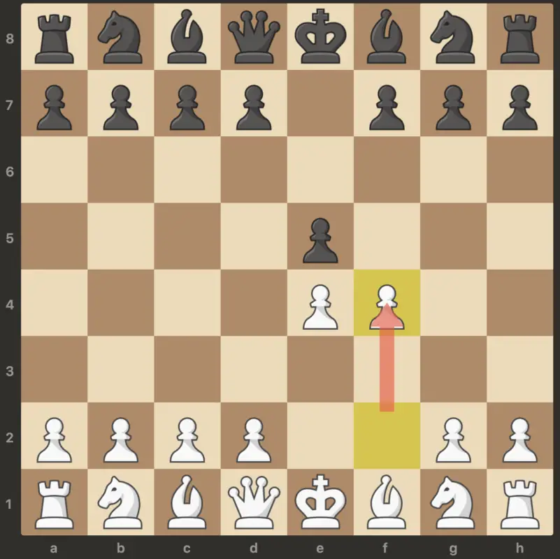 Entonces, ¿cómo se juega el Gambito de Rey? Para comenzar a jugar el gambito de rey, juegue 1. e4 e5 seguido de 2. f4 (vea la imagen a continuación), que claramente sacrifica el peón o gambito de f4 de las blancas.